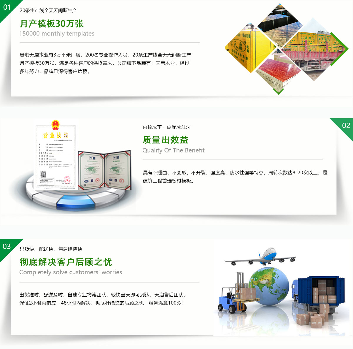 貴港市天啟木業(yè)位廣西貴港市覃塘區(qū),是中國(guó)建筑模行業(yè)規(guī)模十大的企業(yè)之一,有著優(yōu)越地理位置,臨廣東,貴州,湖南,云南、交通運(yùn)輸區(qū)位十分優(yōu)勢(shì)。現(xiàn)有職工近300人,占地50余畝,其中建筑面積近3萬(wàn)平方米。日產(chǎn)量2萬(wàn)張,年產(chǎn)量500萬(wàn)余張;公司正在逐步壯大,旗下有4家分公司,總年產(chǎn)量近1500萬(wàn)張!天啟木業(yè)引進(jìn)芬蘭制膠技術(shù),采用先進(jìn)生產(chǎn)工藝。公司生產(chǎn)的建筑膜板采用優(yōu)質(zhì)的防水膠制作,循環(huán)使用次數(shù)多,品質(zhì)在同行業(yè)內(nèi)認(rèn)可度極高。是一家集產(chǎn)品研發(fā),生產(chǎn),銷售,服務(wù)于一體的綜合型大型民營(yíng)企業(yè)。產(chǎn)品覆蓋全國(guó)20多個(gè)省,市,自治區(qū)。